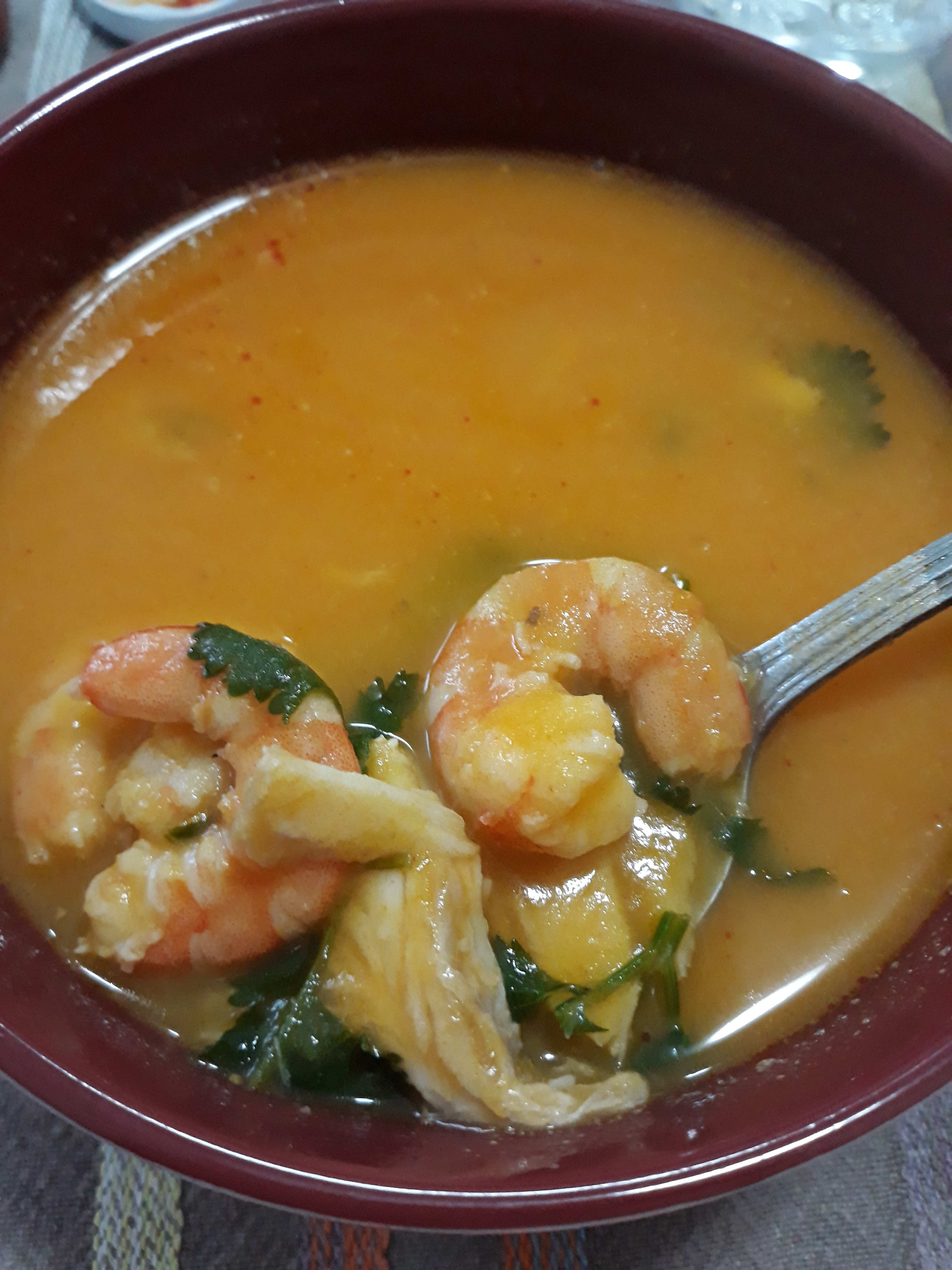 Cozer o peixe com a folha de louro, o sal e a pimenta. Reservar a água da cozedura. De seguida, numa panela, refogar o alho e a cebola em azeite. Quando a cebola estiver translúcida, adicionar o tomate e o pimento e deixar refogar mais um pouco. Adicionar os legumes cortados e deixar ganhar sabor no refogado; assim que estiverem mais coradinhos, acrescentar a água da cozedura do peixe. Depois de cozidos os legumes, triturar bem até obter uma sopa cremosa. Adicionar o piri-piri, rectificar os temperos e acrescentar o peixe e os camarões cozidos. Pode enriquecer com outro marisco e acompanhar com pão (do bem, claro). Adicionar centros a gosto e servir ainda bem quentinha. Já está!