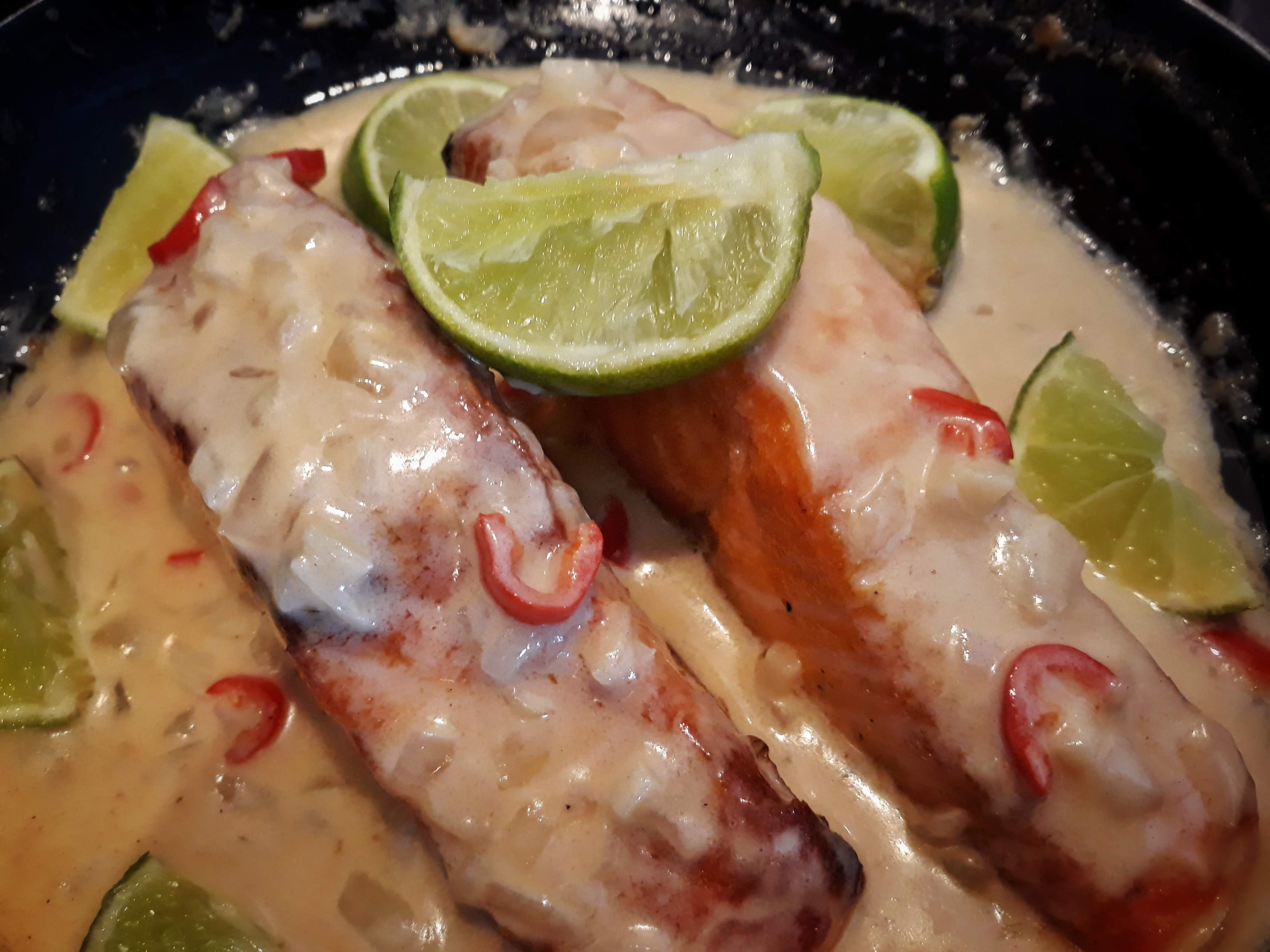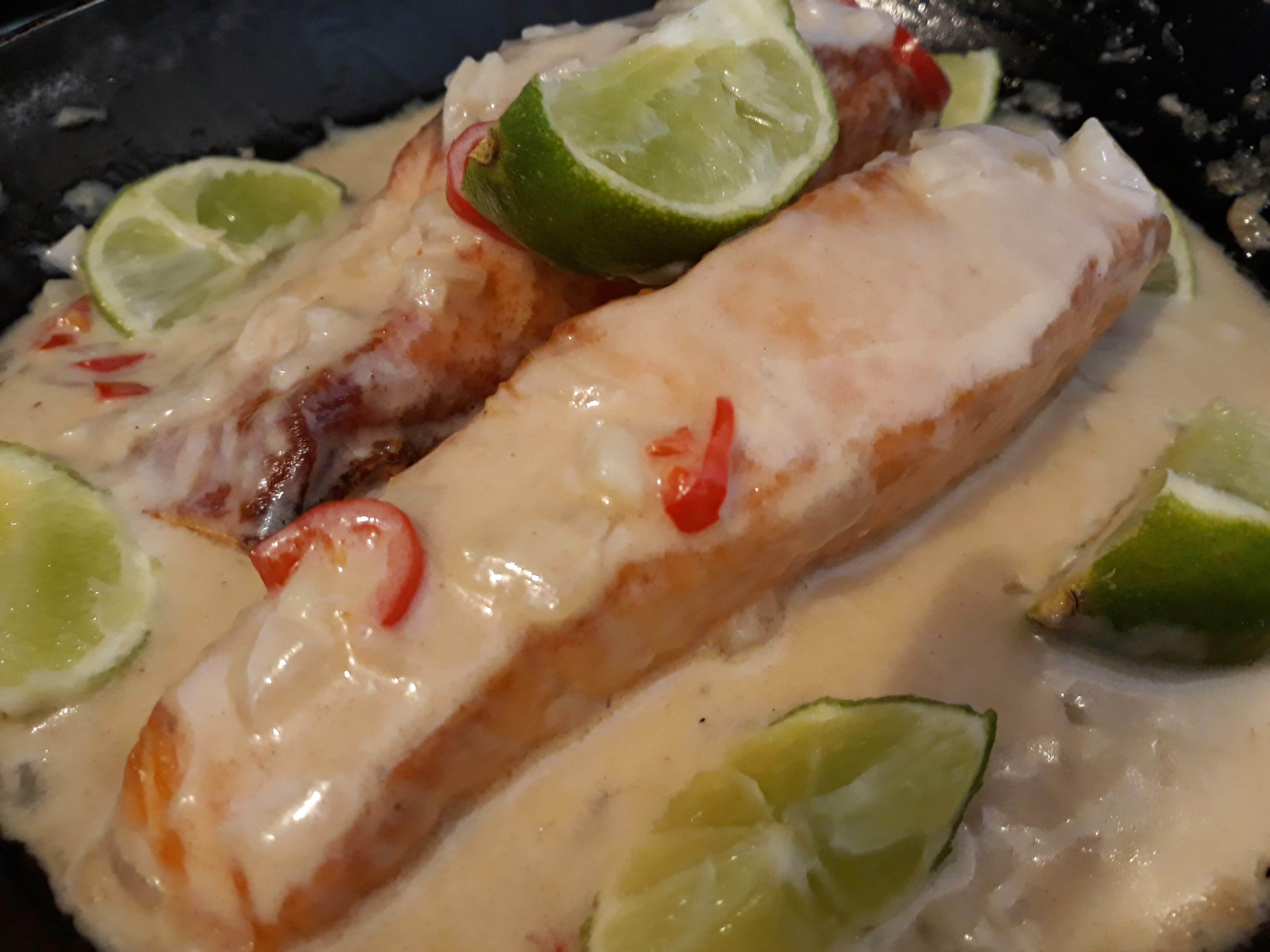 Acrescentar 1-2 cs de óleo de coco à frigideira e adicionar a cebola e o alho picados, o gengibre ralado e a malagueta. Ir mexendo e deixar cozinhar até a cebola ficar translúcida. Juntar o leite de coco e ir mexendo sempre, até atingir a cremosidade desejada. Juntar o salmão novamente à frigideira e cobrir tudo com o sumo de uma lima. Virar o salmão para que este fique bem coberto de molho e servir com uma lima cortada em meias-luas e com o manjericão. Já está!