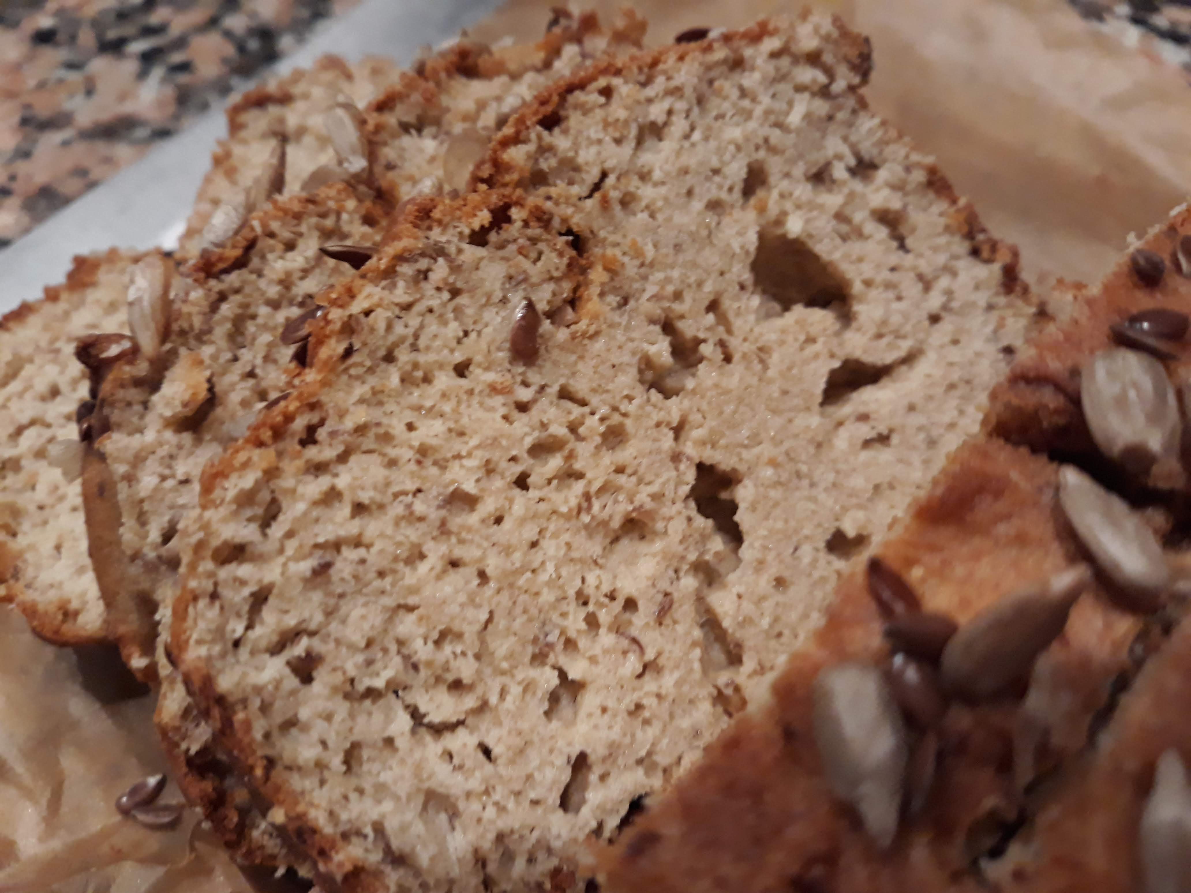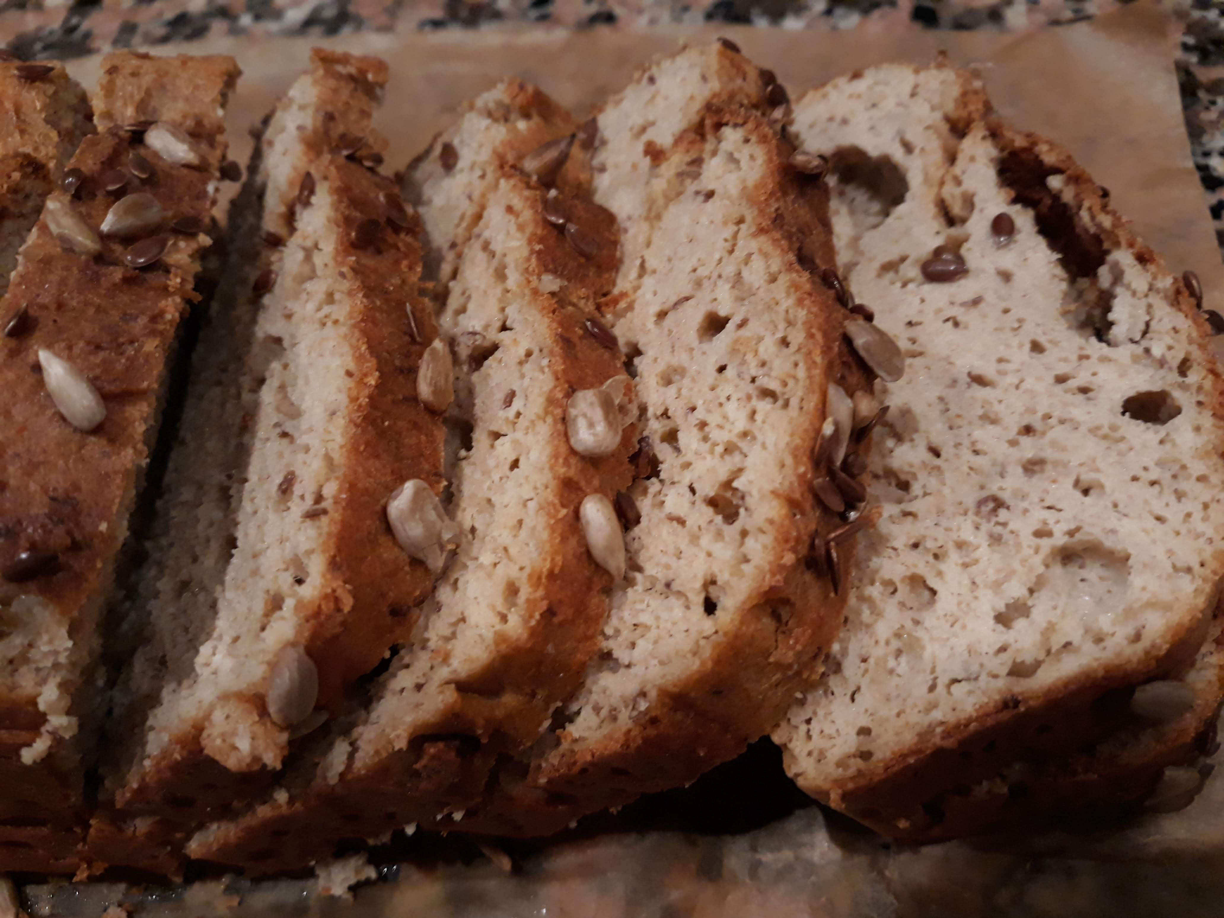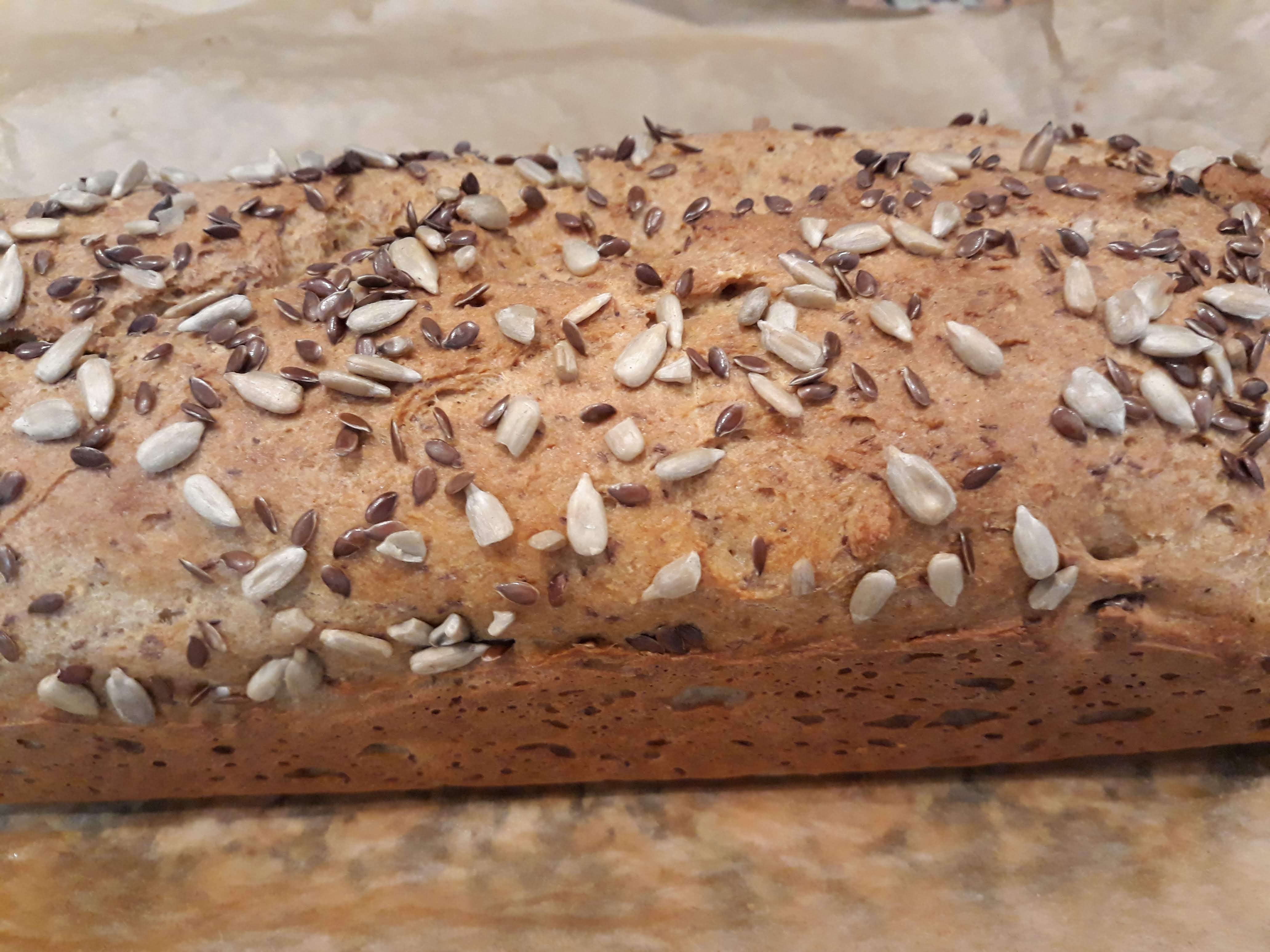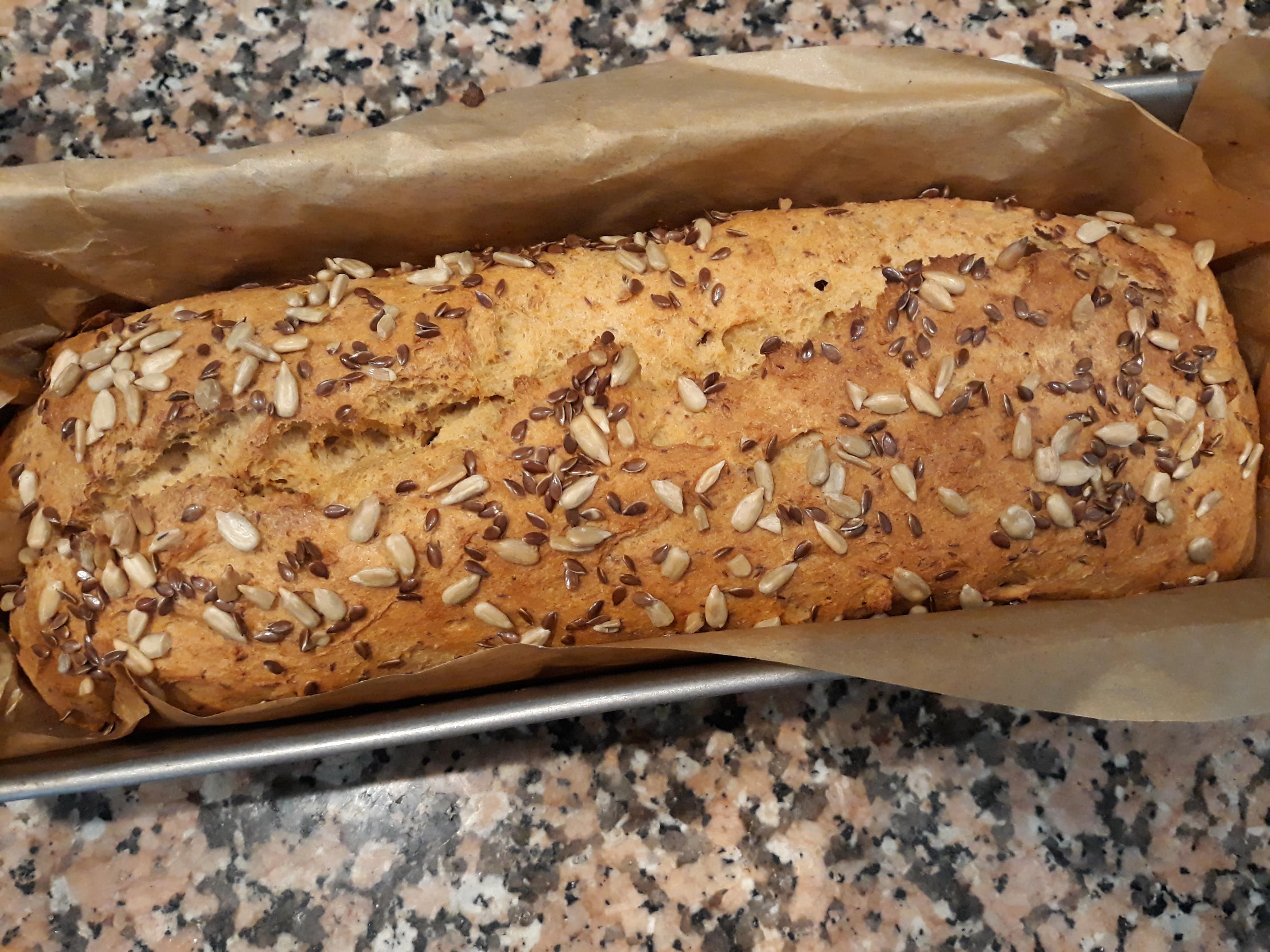 Verter a massa para uma forma de pão forrada com papel vegetal, acrescentar as semenstes e levar ao forno durante cerca de 50 minutos – podem fazer o teste do palito para ir verificando a cozedura, mas lembrem-se que este pão fica sempre um pouco húmido. Já está!