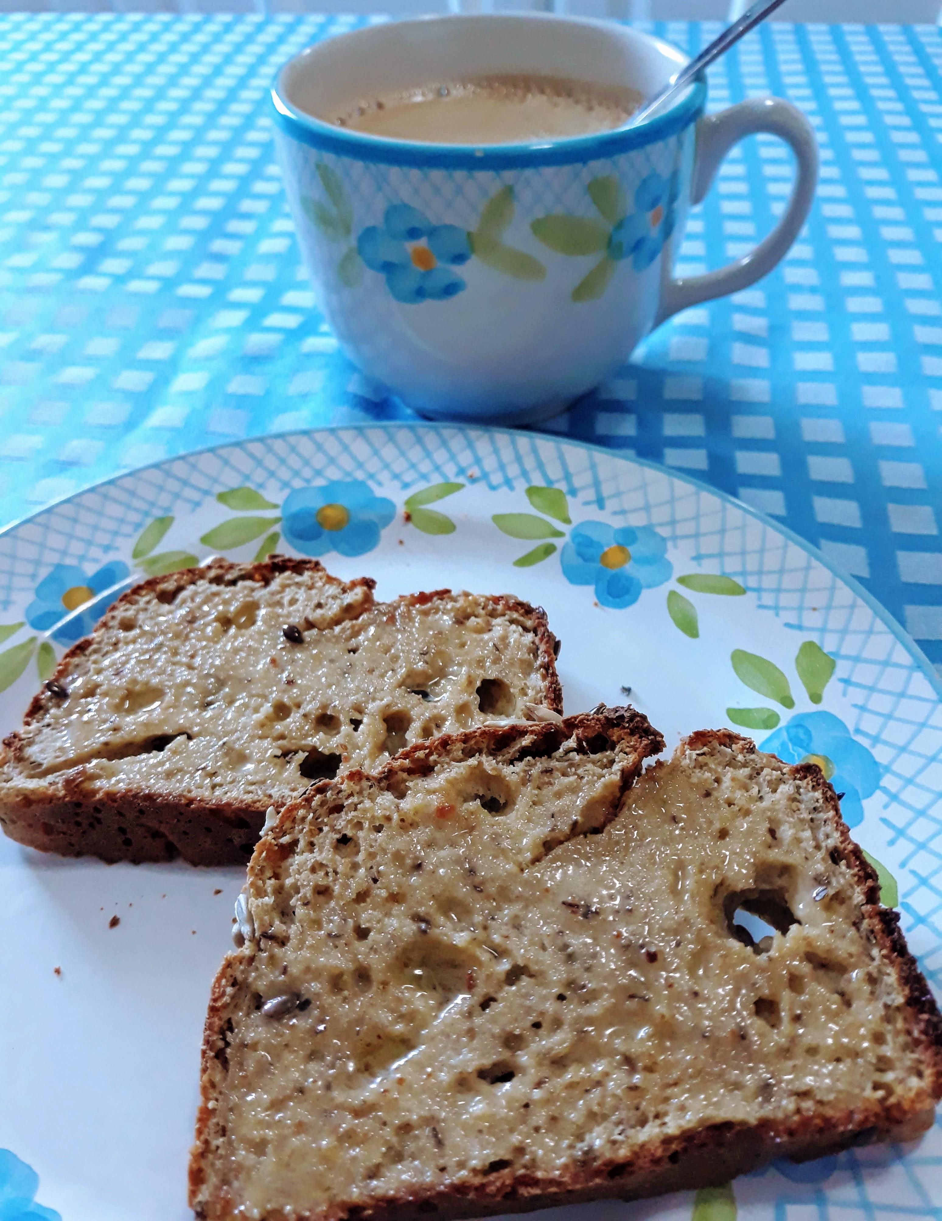 Estava curiosa para saber de que forma é que o quark afectaria o sabor e a textura do pão. Fica com um travo um pouco mais ácido, variável conforme o quark que utilizarem. Em termos de textura, fica um pão mais denso, com favos e húmido – mas se puserem na torradeira fica óptimo na mesma. Também podem fatiar e deixar secar no forno durante alguns minutos.