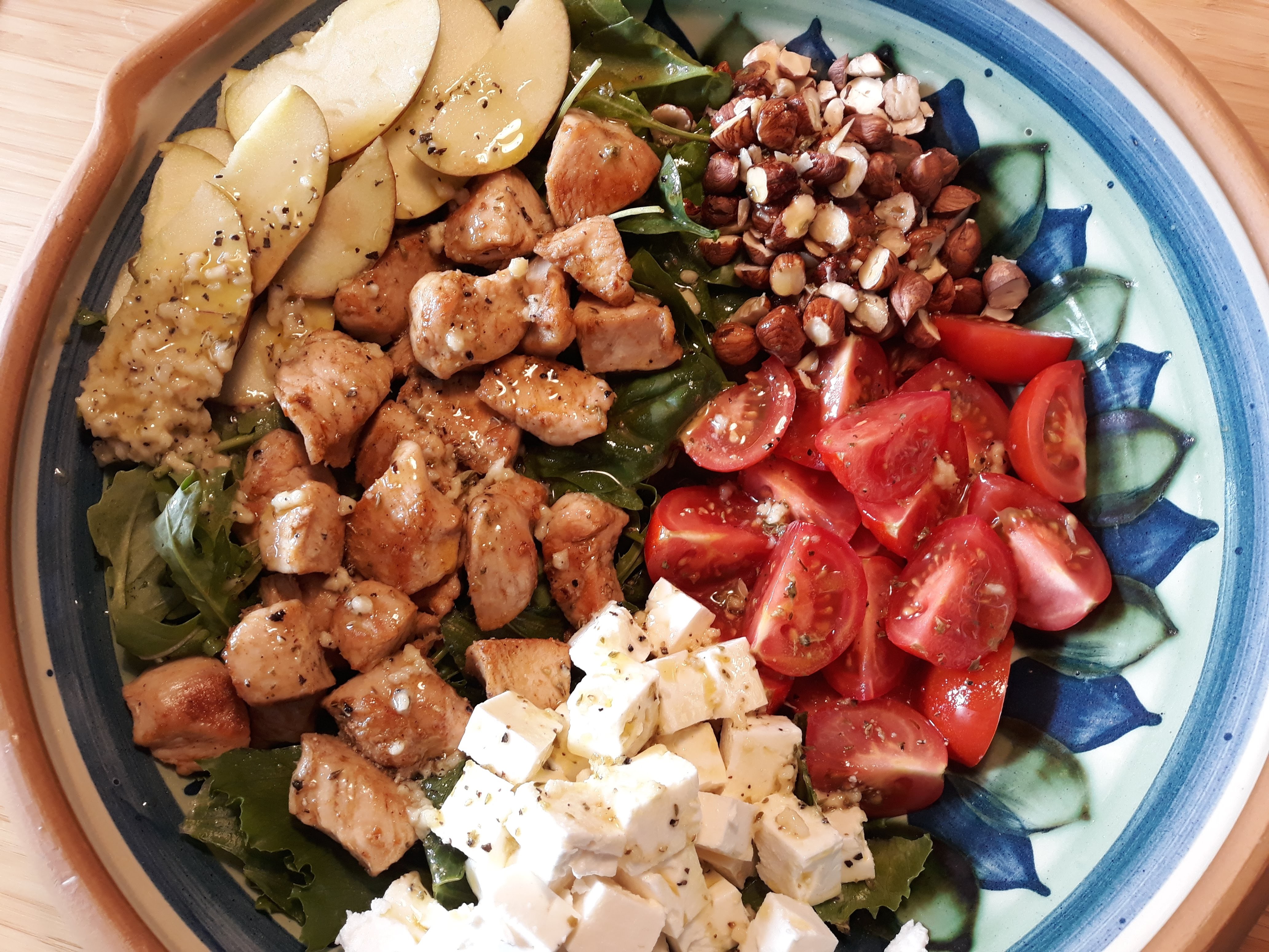 Numa saladeira grande, colocar os vegetais, os tomates, as avelãs, a fruta, o queijo e o frango.