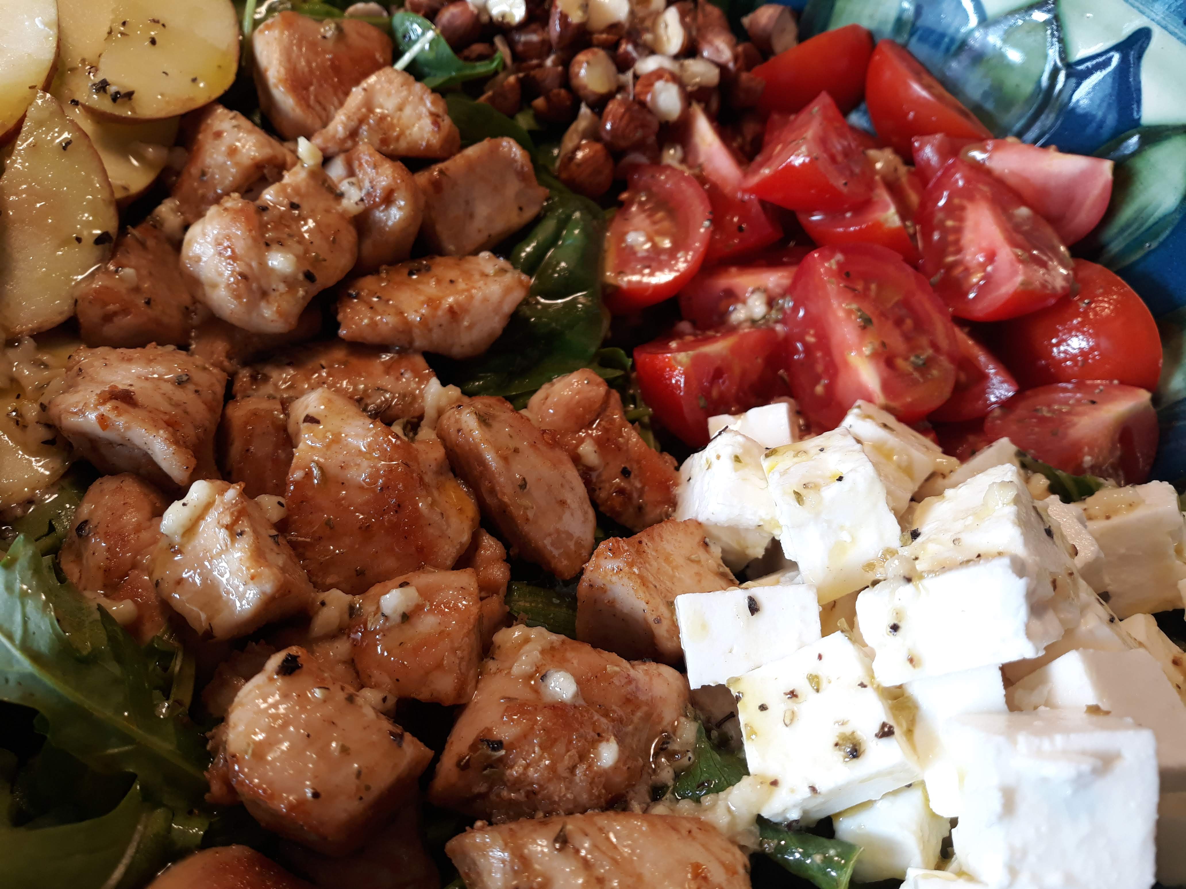 A pensar em todos esses dias de diversão e descanso no exterior, em que não nos queremos chatear muito com pratos complexos (até porque o calor não o permite), trouxe-vos esta salada maravilhosa, com uma combinação de sabores fantástica, rápida de se fazer e bastante saciante. Comer só verdes, numa refeição primal, não faz sentido: daí a duas horas estamos a pensar em comer um belo de um bife, ou chocolate, ou coisas piores. Por isso, esta salada também tem proteína de qualidade, presente nos peitos de frango; e é uma salada rica em fibras, vitaminas e minerais, presentes nos vegetais, e antioxidantes e ómegas-6 e 9, presentes nas avelãs. Em suma: uma refeição fresca e equilibrada.
