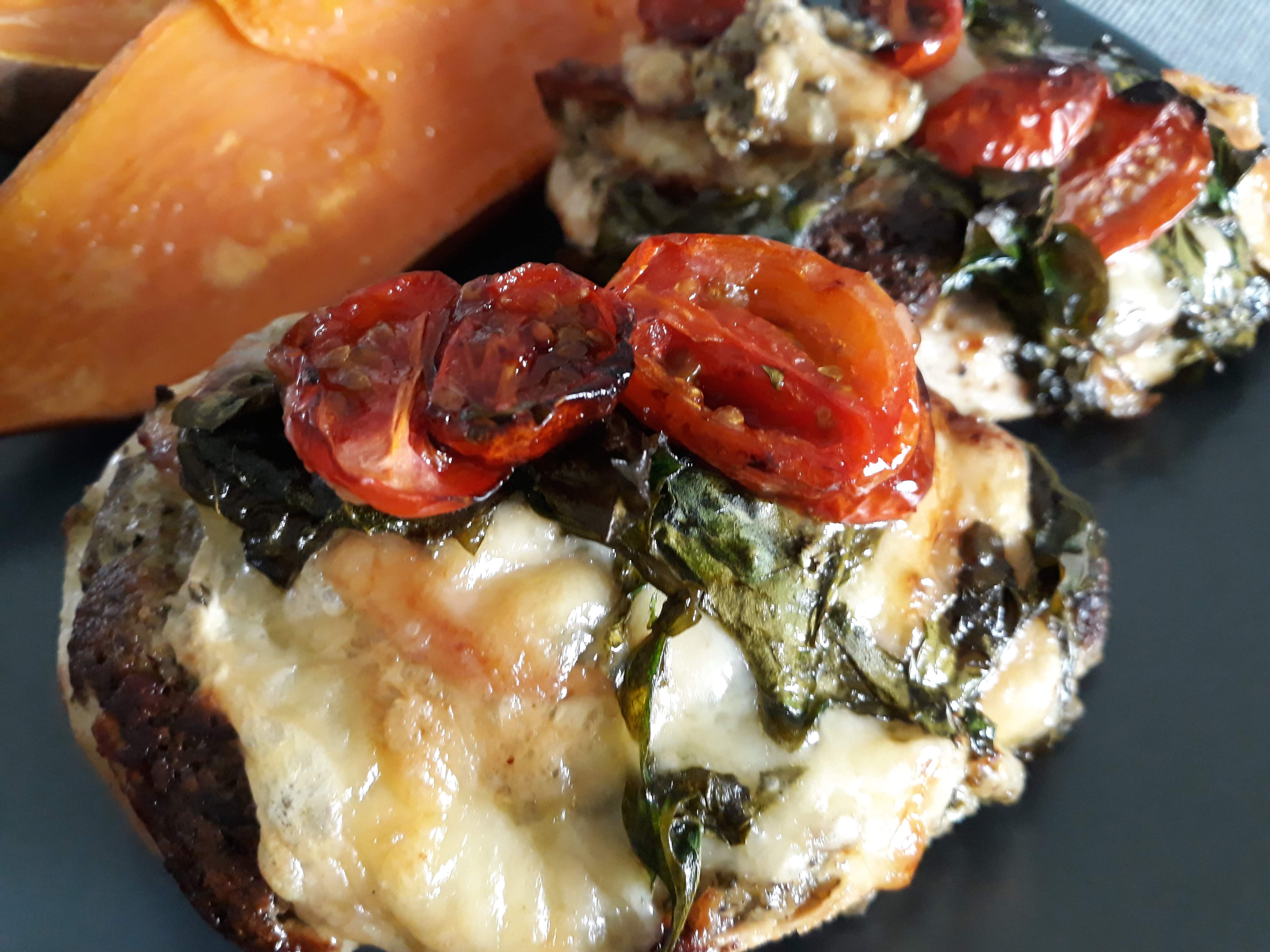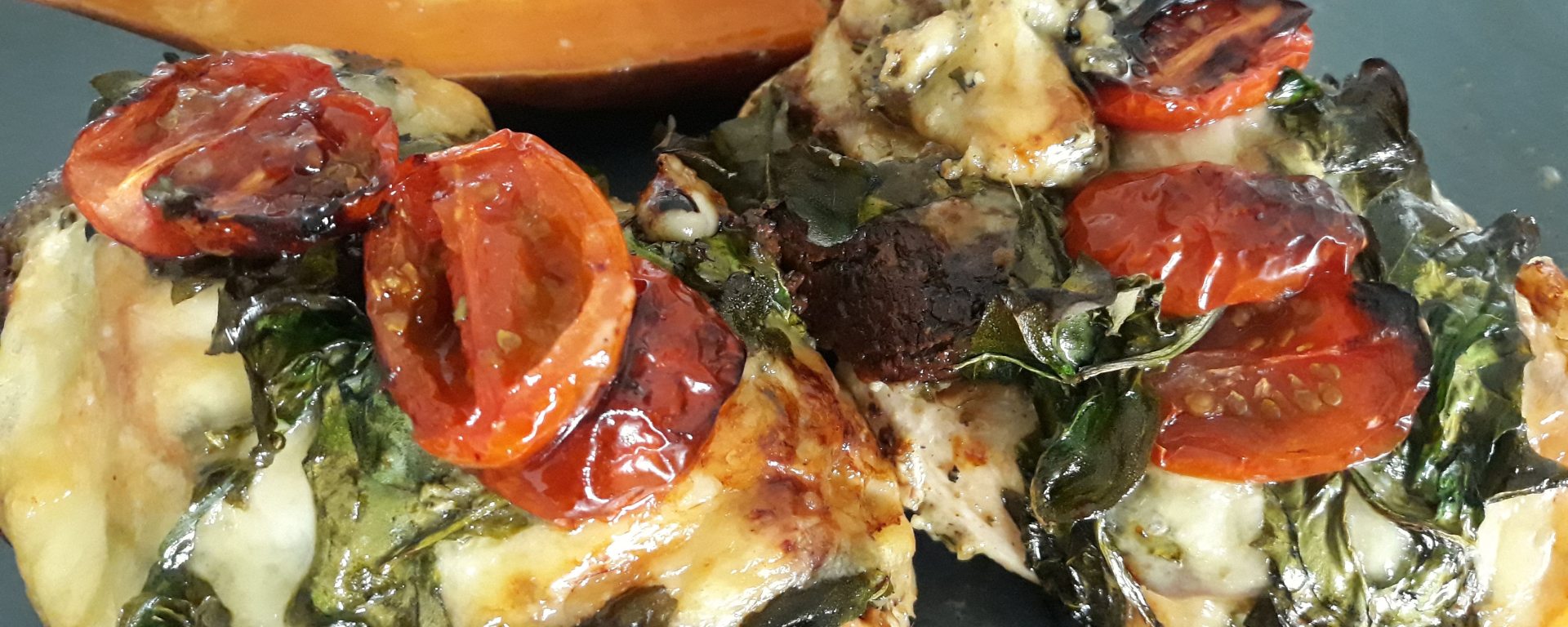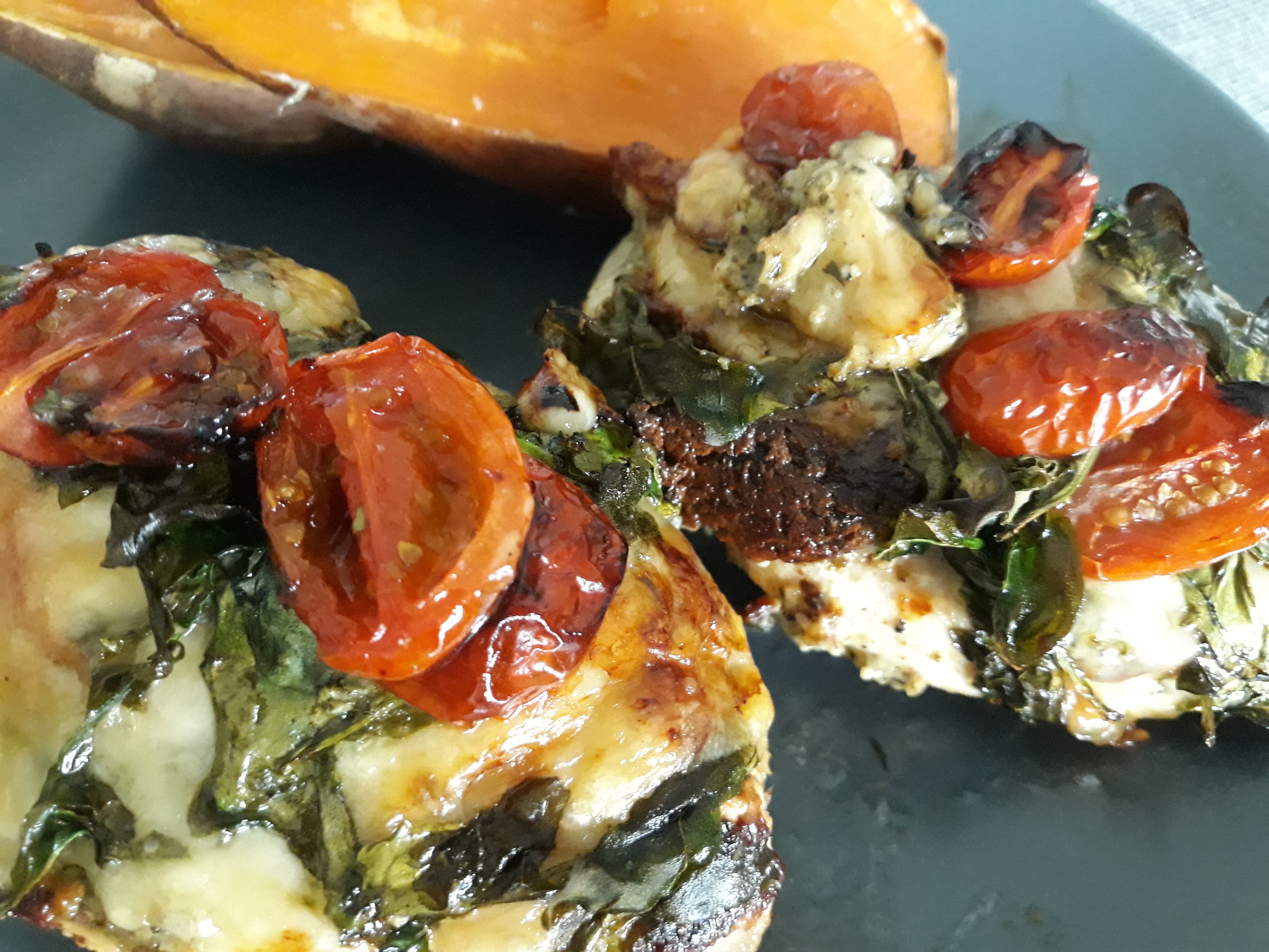 Untar um tabuleiro de ir ao forno com azeite e dispor os peitos de frango nesse tabuleiro, barrando-os com um pouco de pesto. Cobrir com as fatias de queijo, os espinafres e os tomates cherry e finalizar com um fio de azeite. Podem acrescentar outros legumes se assim o desejarem. Deixar no forno durante cerca de 10-15 minutos (ou até o queijo derreter e os vegetais ficarem cozinhados e cheios de cor). Já está!