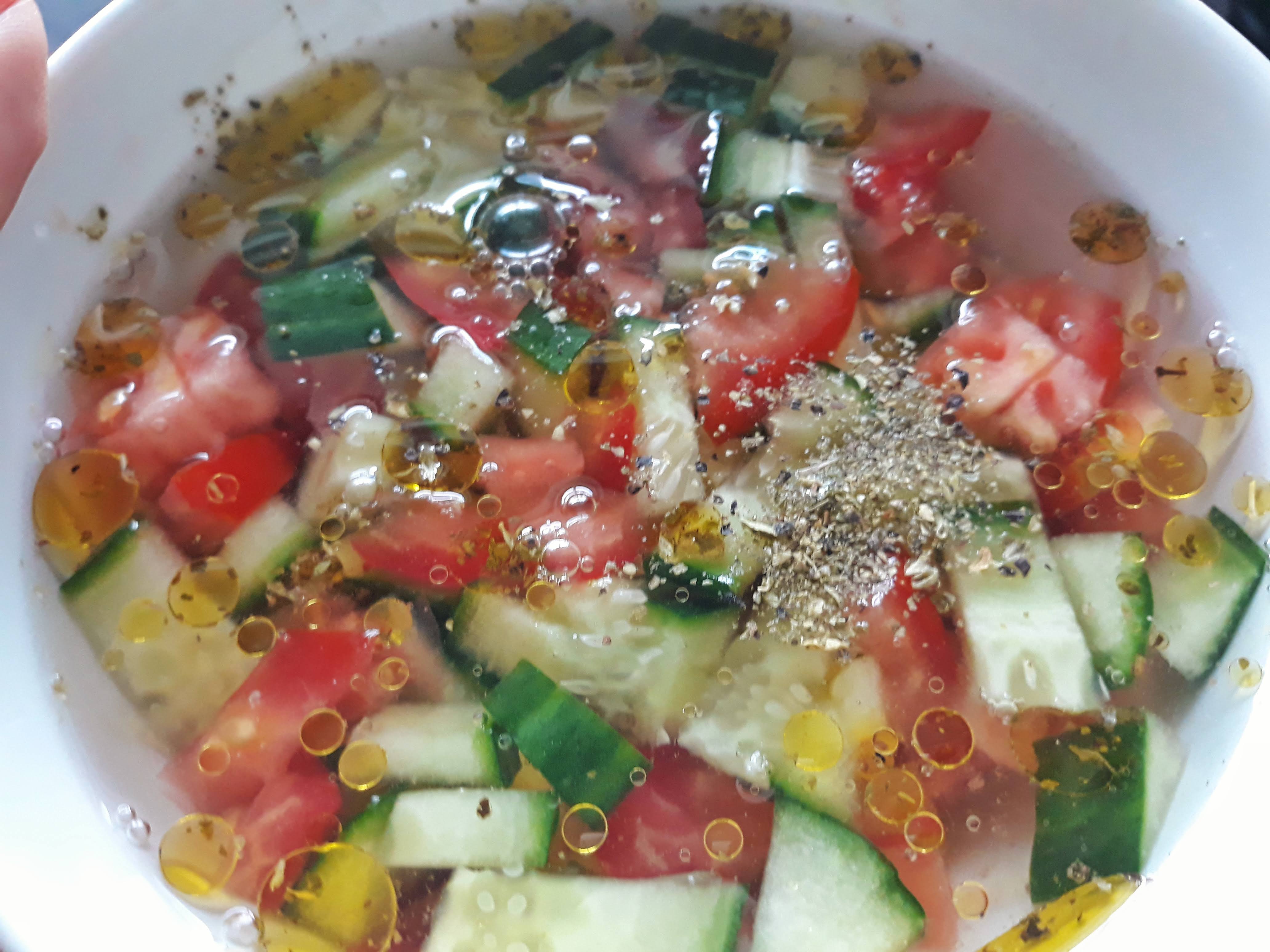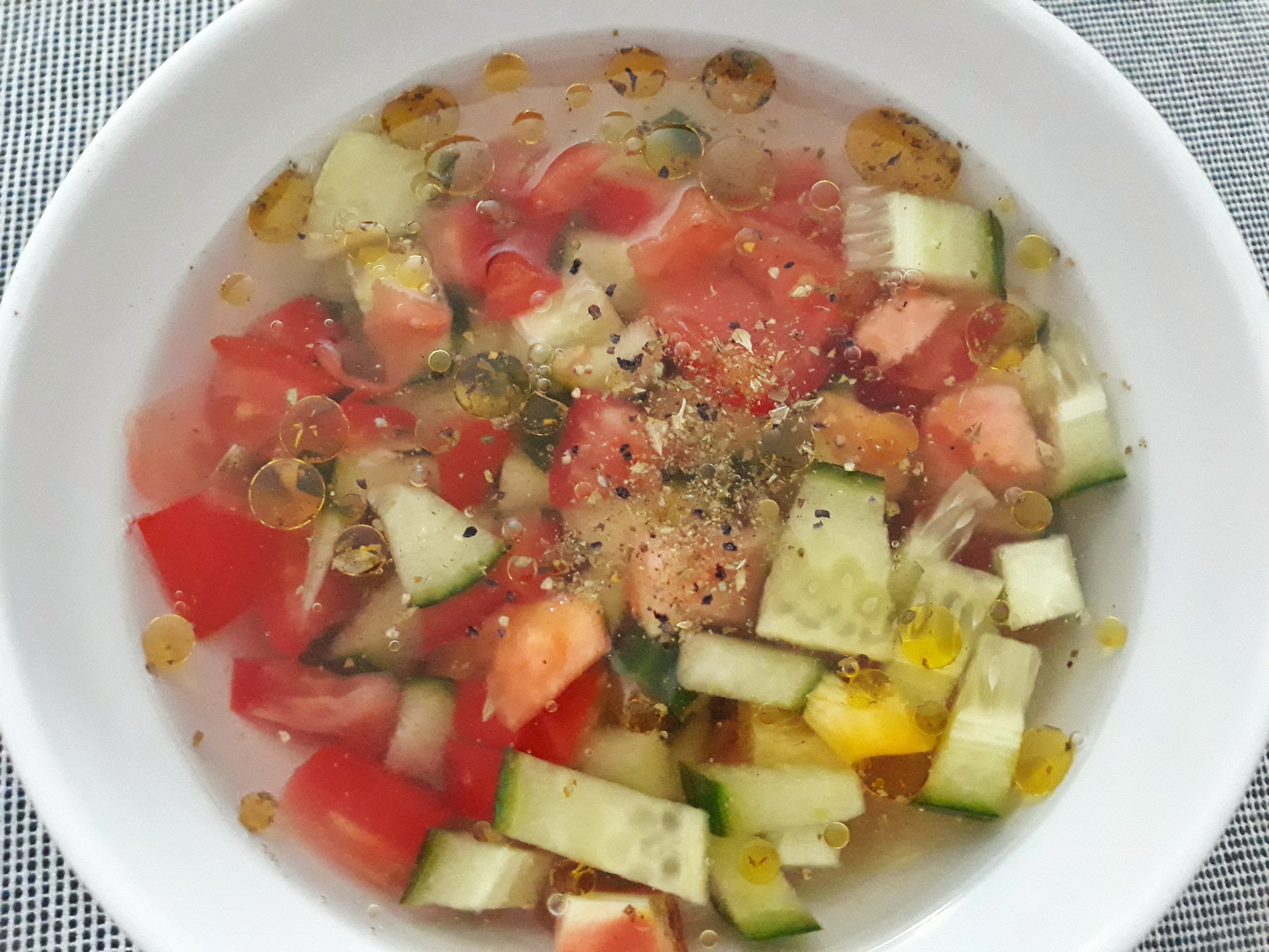 De seguida, cortar os tomates sem pele, o pepino e o pimento em cubos pequenos, colocar na tigela e juntar a água bem fria, bem como os cubos de gelo.