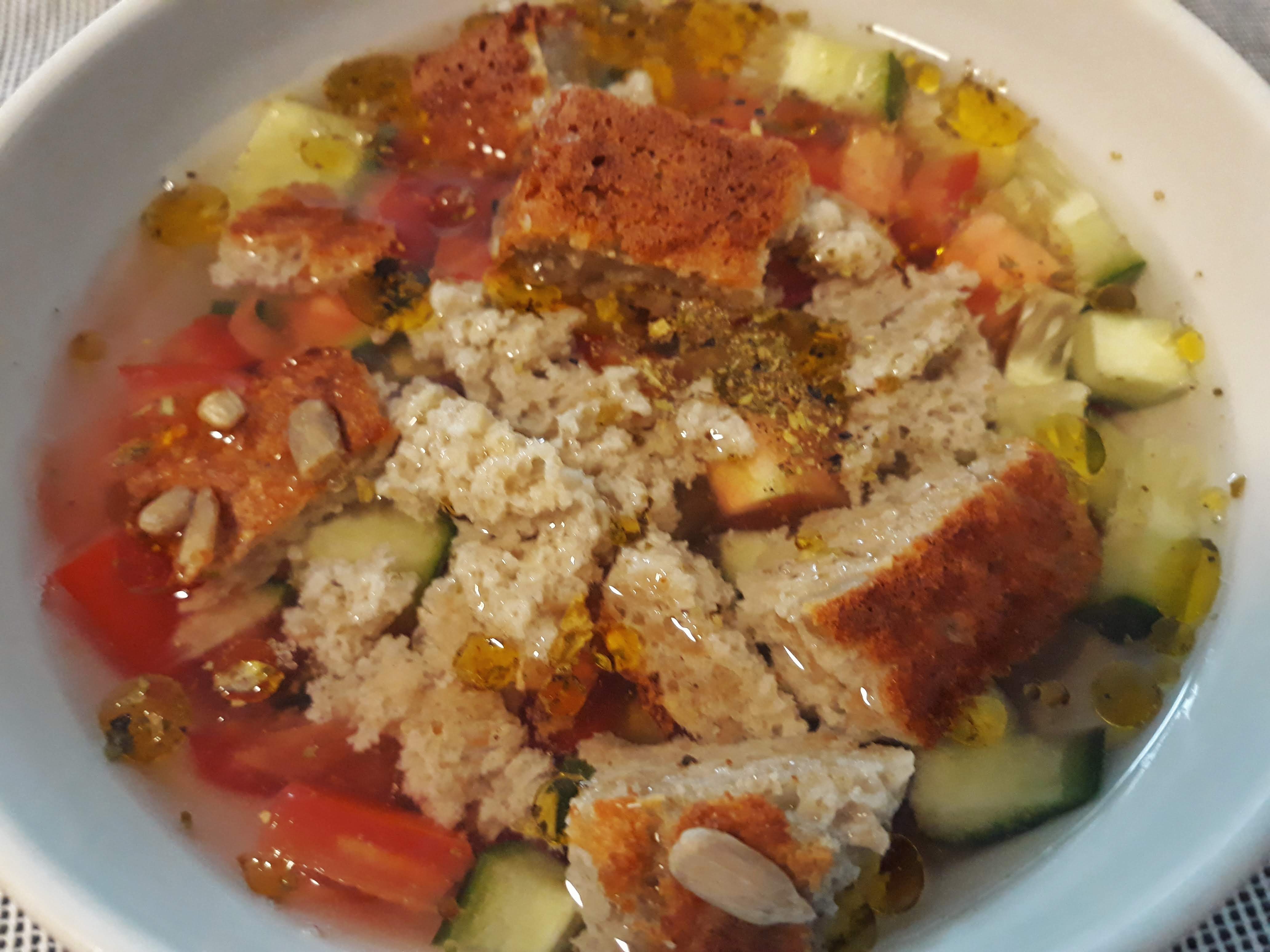 Servir com o pão paleo. Eu torrei e esfarelei uma parte para a tigela e juntei outra parte em bocados. Usem como entrada ou acompanhamento para uma boa proteína. Já está!