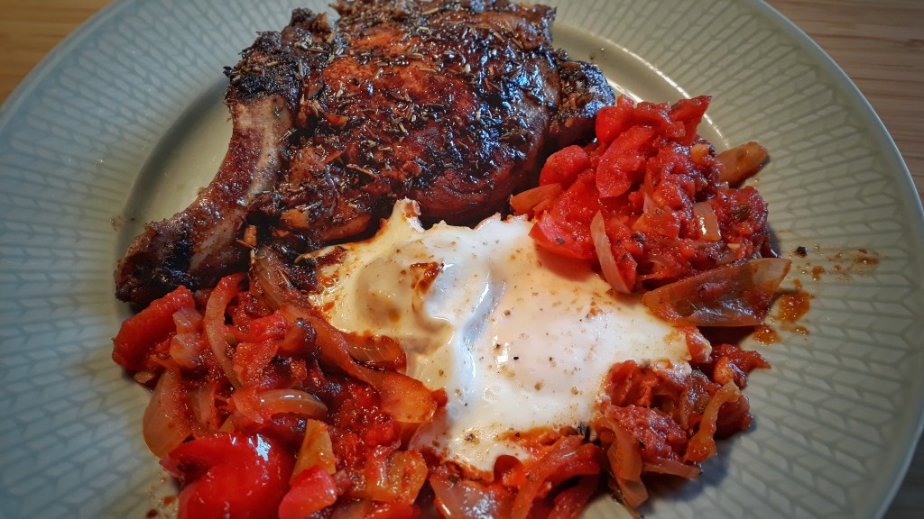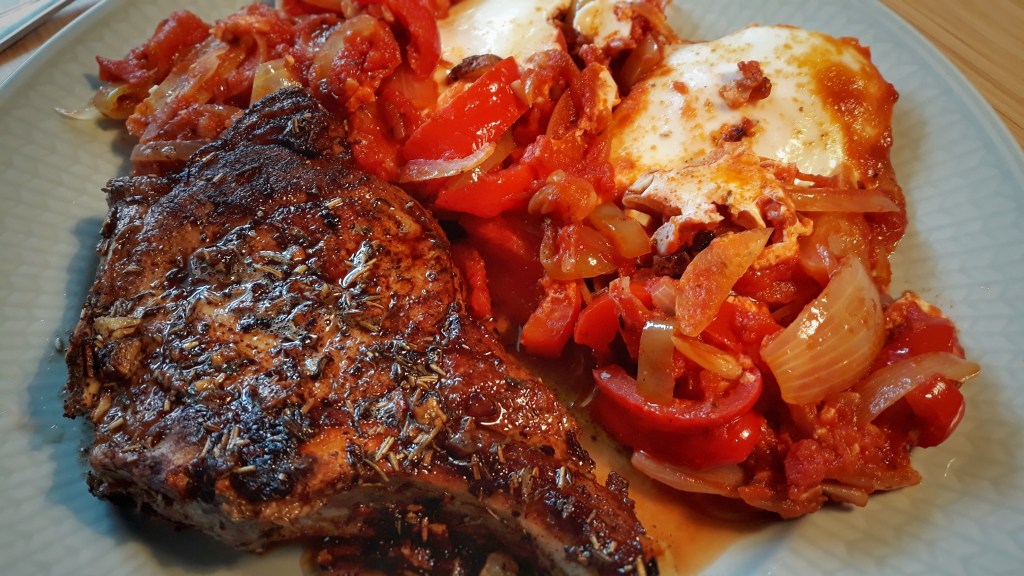 A ideia deste prato é basicamente esta: juntar duas coisas rápidas, fáceis, económicas e que são de babar. Porquê? Porque a minha vontade era comer ou costeletas com molho de manteiga de alho ou ovos de tomatada. Estas opções foram a jogo na minha cabeça e deu empate. Depois lembrei-me de, como sou eu que faço a comida, não preciso de escolher uma das opções – basta juntá-las. Portanto… vamos a isso!